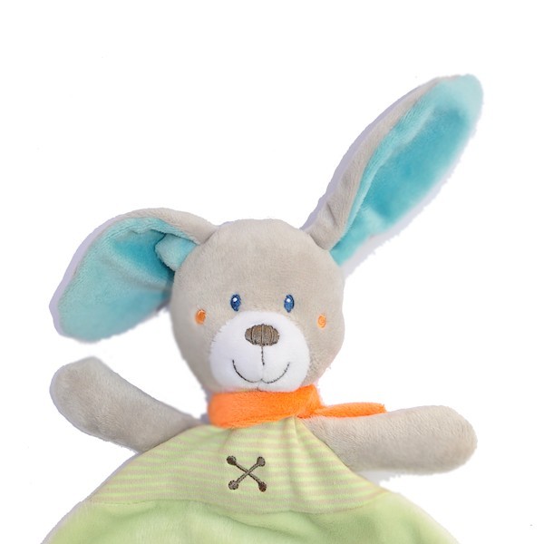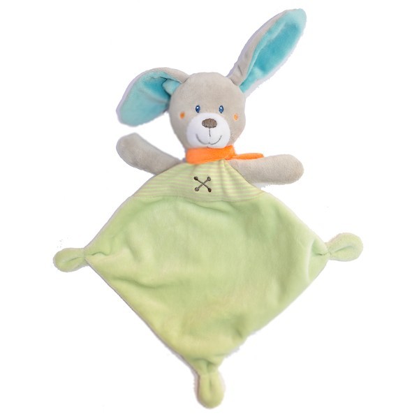 Joli et très doux, ce doudou est orné d'une tête de lapin. Bébé adorera tétouiller les oreilles de ce lapin et mâchouiller les coins noués du mouchoir.
