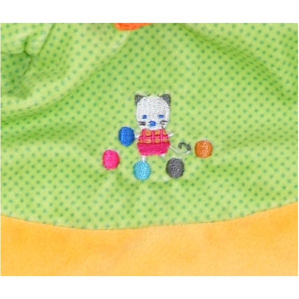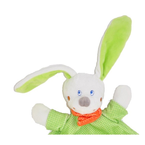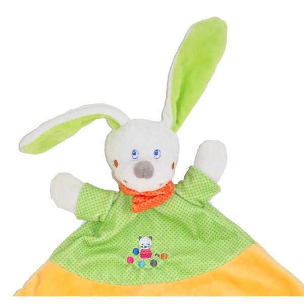 Doudou Lapin jaune et vert. Ce joli doudou aux couleurs vives participera à l'éveil de bébé.